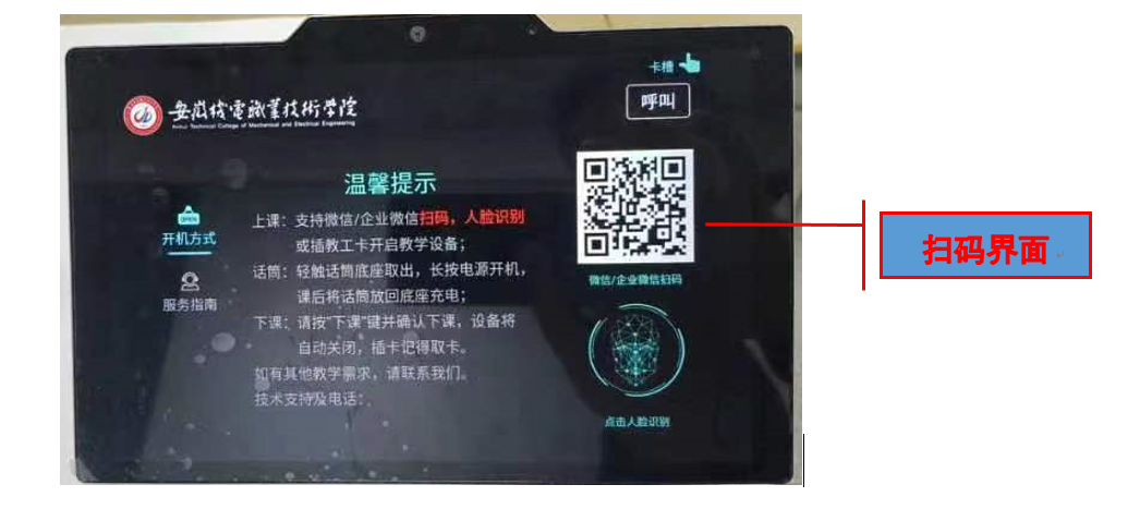 2、微信扫码开启:触碰讲台上的中控显示屏后,出现扫码界面,使用“微信”进行扫描后各项设备自动通电并完成启动。下课时,点击中控显示屏界面上的“下课”按钮,确定后,各设备自动断电关机,人员直接离开即可。(注:教师必须提前扫描下方二维码加入学校企业微信并完成人员认证。)