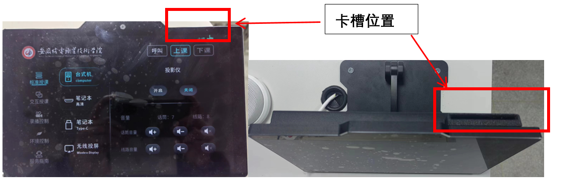 1、校园卡开启:在读卡器上插入教师个人校园卡(插卡位置在中控显示屏右上方),稍等片刻,各项设备自动通电并完成启动。下课时,拔出校园卡,各设备自动断电关机,人员直接离开即可。